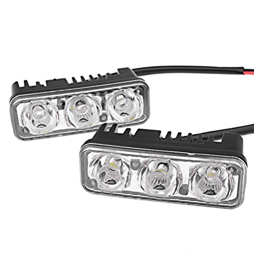 Чифт универсални LED дневни светлини с 3 диода, подходящи за всякакви автомобили. Удароустойчиви, водоустойчиви и устойчиви на прах и корозия. LED светлините са подходящи за използване като дневни светлини на автомобила.
