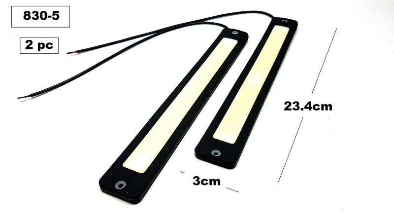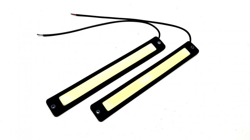 Диодни дневни светлини със студена бяла светлина. Моделът е пластичен и може да се закрепи и на наклонена повърхност. Комплект 2 броя. Могат да се залепят и с двойнолепяща лепенка (включена в комплекта), както и с болчета - също включени в компекта.