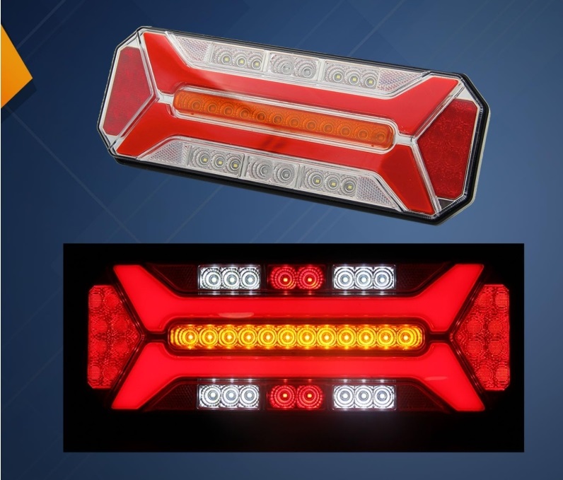 Многофункционален LED стоп с 5 светлинни функции и динамичен мигач, подходящ за камиони, ремаркета, платформи и други товарни превозни средства. Работи в диапазон 12–24V, което го прави универсално решение за различни видове инсталации.