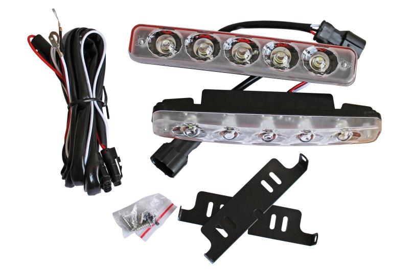 Компект универсални LED дневни светлини с 5 диода с лупи, подходящи за всякакви автомобили. Удароустойчиви, водоустойчиви и устойчиви на корозия.