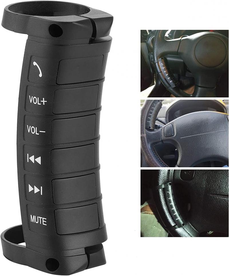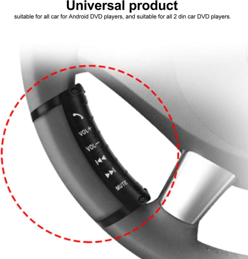 Безжично универсално bluetooth дистанционно управление за волан за мултимедии 2 DIN (DVD MP5 player) с 6 бутона, лесно за инсталиране и здраво фиксиране към волана. Улеснява работата с мултимедийния плейър по време на шофиране като може да приемате телефонни разговори; да увеличавате или намалявате звука по време на разговор или на мултимедията; да превключвате между песните, както и да изключите звука на плейъра.