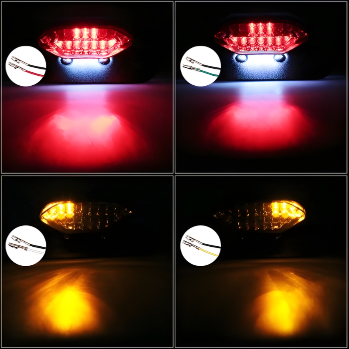Мултифункционален LED стоп за мотоциклет, съчетаващ в едно компактно тяло стоп светлина, мигачи и осветление за регистрационен номер. Практично и модерно решение, което подобрява видимостта, безопасността и визията на вашия мотор.