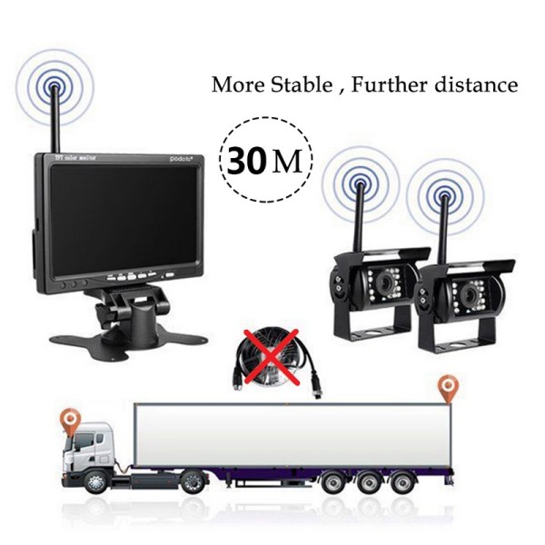 Този комплект за паркиране разполага с безжична връзка между монитора и камерите в комплекта. Тук не се налага инсталация на кабели по цялата дължина на превозното средство. Единствено се подава захранване към монитора и камерите, след което се настройват. Комплектът е предвиден най-вече за по-дълги и големи превозни средства точно поради тази причина – не е нужна кабелна връзка между двете устройства, което улеснява използване им.