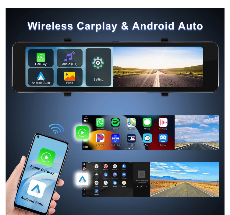 Видеорегистратора е преносим Carplay екран, монтиран на огледалото , който ви позволява да използвате безжично Carplay и Android Auto без разглобяване или модификации на окабеляването на оригиналния ви автомобил. Той е идеален за почти всички превозни средства с контакт за запалка и работно напрежение от 7-32V , което покрива около 98% от всички настоящи модели.