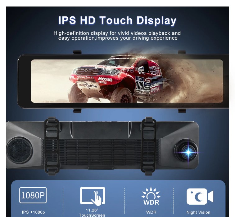 Огледална видеорегистраторна камера с безжична връзка Carplay Android Auto, 11.26” IPS сензорен екран за предно и задно виждане с двойна камера за автомобили и камиони, управление на видеото/Bluetooth/асистент за паркираненощно виждане/цикличен записОгледална видеорегистраторна камера с безжична връзка Carplay Android Auto, 11.26” IPS сензорен екран за предно и задно виждане с двойна камера за автомобили и камиони, управление на видеото/Bluetooth/асистент за паркираненощно виждане/цикличен запис